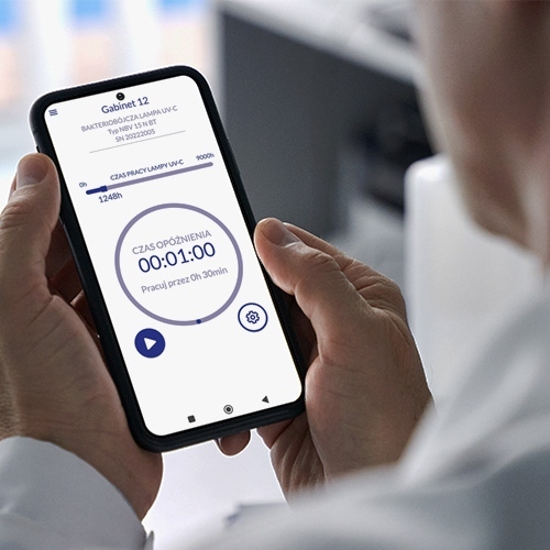 Aplikacja NBV App i moduł zdalnego sterowania BT Switch dają możliwość ustawienia bezpiecznej zwłoki czasowej, którą użytkownik wykorzystuje na opuszczenie pomieszczenia (lampę można włączyć również z zewnątrz, ponieważ zasięg Bluetooth wynosi kilka metrów). Ponadto w aplikacji można ustawić żądany czas dezynfekcji i go dowolnie zmieniać na przykład w zależności od pory roku. Latem stosować doraźną dezynfekcję ok. 15 minut, a w okresie jesienno-zimowym kiedy szaleje grypa i inne zarazki, nawet do kilku godzin, aby mieć pewność, że cały gabinet zostanie wystarczająco zdezynfekowany. Aplikacja NBV App pozwala na zatrzymanie naświetlania oraz jego wznowienie a także całkowite wyłączenie. Pauzę w dezynfekcji można wykorzystać jeśli się czegoś zapomni z pomieszczenia. Raz ustawione parametry mogą być stosowane przy każdej kolejnej dezynfekcji - włączone w aplikacji lub za pomocą przycisku sterującego (na urządzeniu albo na module BT Switch do lampy zakupionej wcześniej).