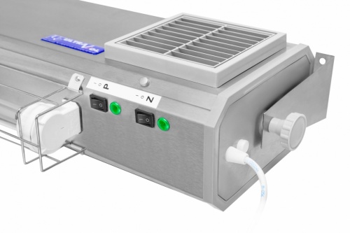 Wysokojakościowy wentylator umożliwia przepływ powietrza, przez komorę dezyfekcyjną, w której znajdują się wewnętrzne promienniki bakteriobójcze. W związku z tym, lampę można uruchamiać nawet podczas pobytu personelu i pacjentów w gabinecie. Promienniki zewnętrzne natomiast zwiększają wydajność lampy w czasie, kiedy nikt nie przebywa w pomieszczeniu.